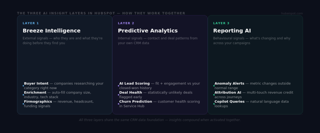 The phrase gets used loosely, so it’s worth being precise. In HubSpot, AI-driven insights come from three distinct sources, and they work differently.